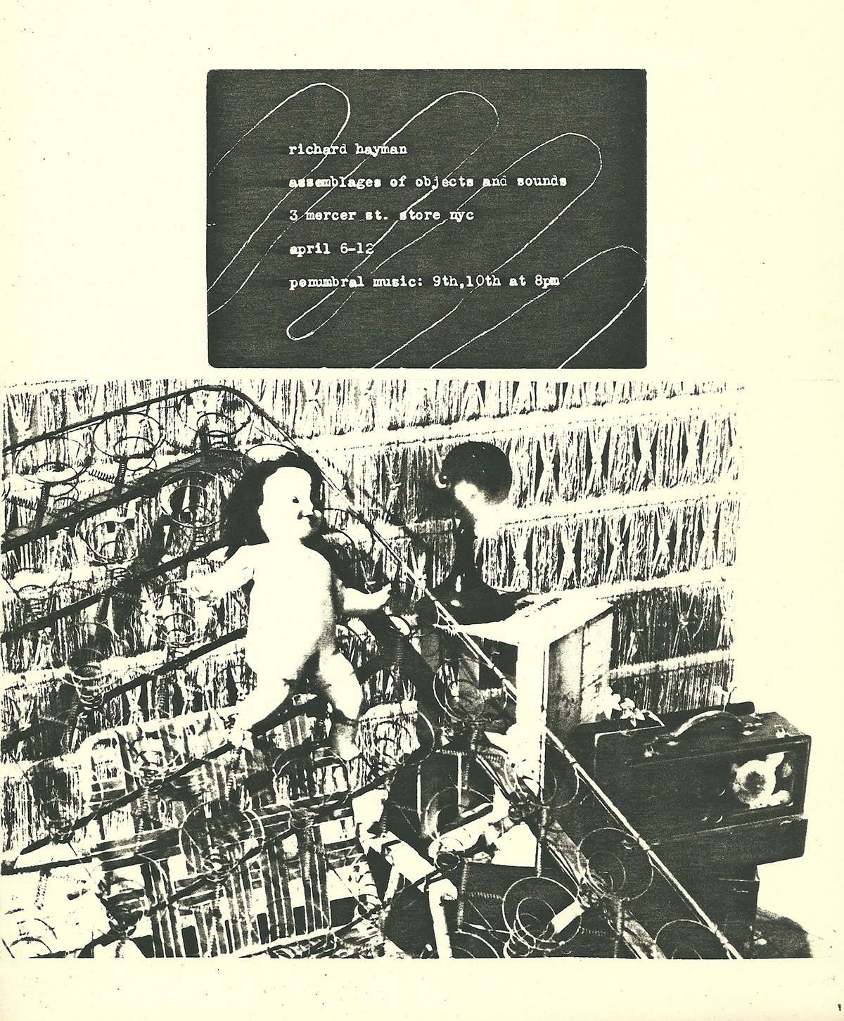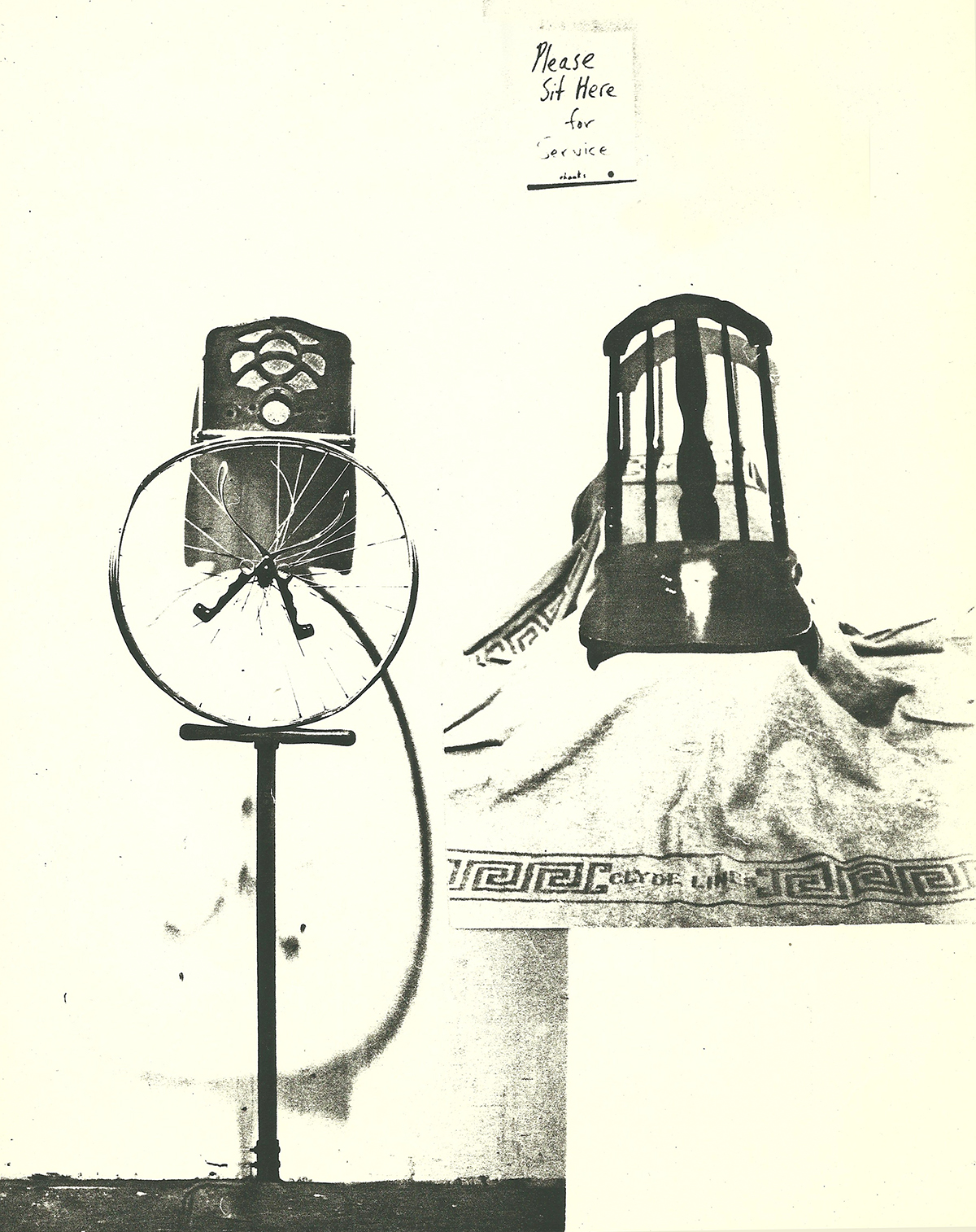 Assemblages – (1974) Exhibition for objects including chair, bedspring, blinds, doll, radio, cricket cage, bike wheel, obstetrical forceps, electronics. Kinetic sound assemblages: “Breeze”, “Radio Lawn”, “Chime Shade” * Stefan Eins Gallery 3 Mercer Street Store NYC April 6-12 1974