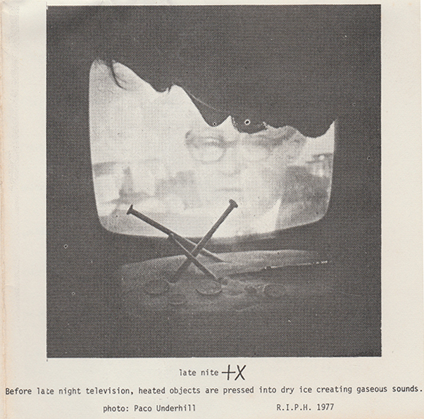 For hot nails, soldering gun, coins, pressed into dry ice to produce gaseous sounds before the glow of late night tv. * Performed as part of Dreamsound, event for sleeping audience 1976 (IMAGE: Paco Underhill)